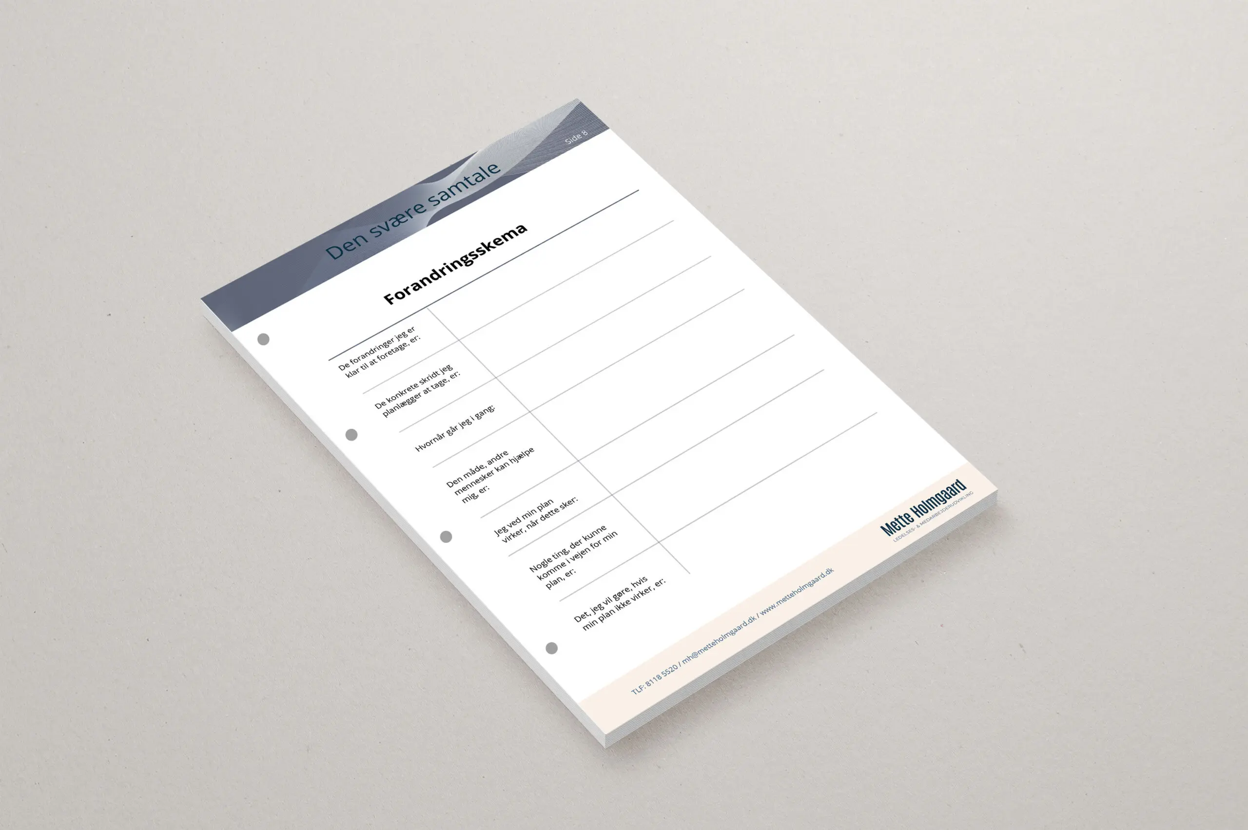 Begge blokke består af 15 sider, som guider dig gennem samtalens faser – fra forberedelse til opfølgning. Du får refleksionsfelter, spørgsmål og konkrete skemaer, der hjælper dig med at skabe overblik, formulere dit budskab og fastholde fokus undervejs.